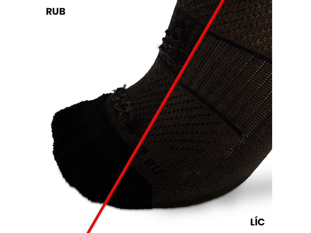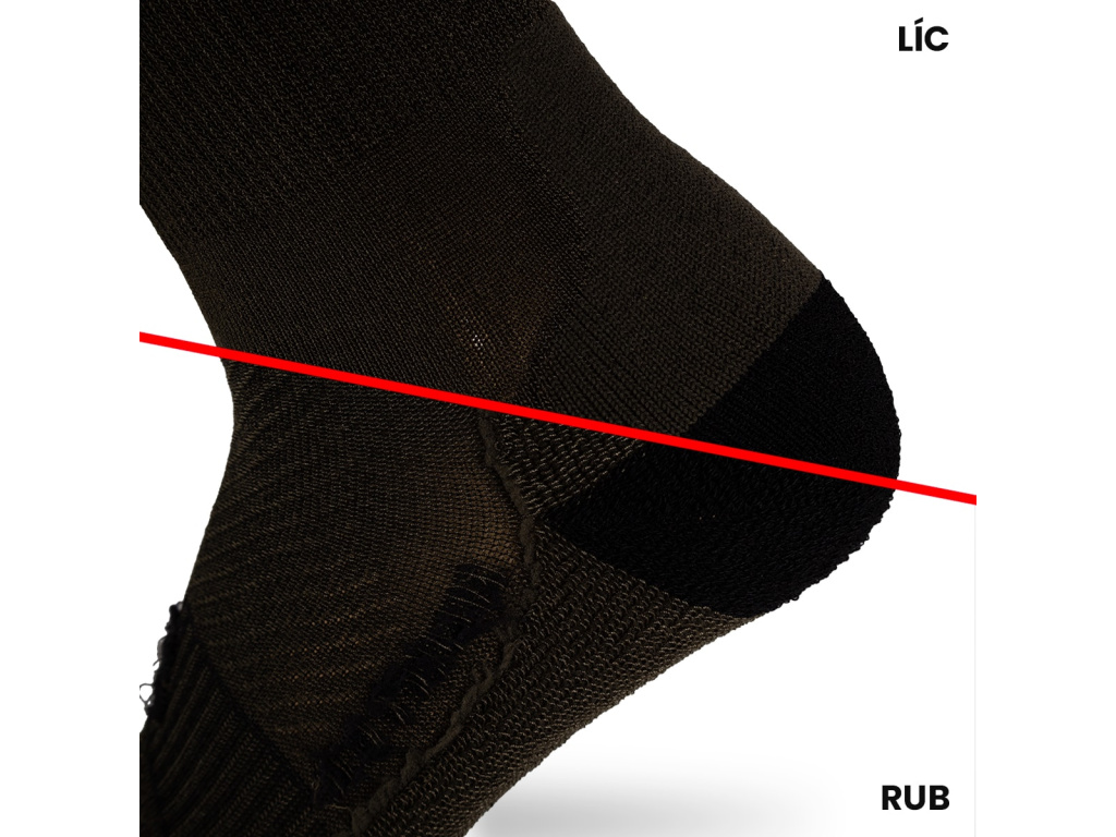 Základním materiálem je speciálně upravený polyester doplněný o zesilovací polyamidy a elastická vlákna. Tuhle ponožku jen tak nezničíš.