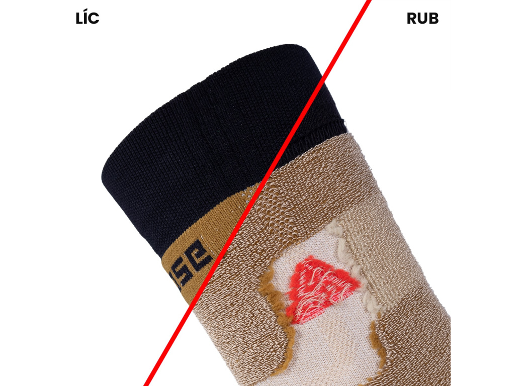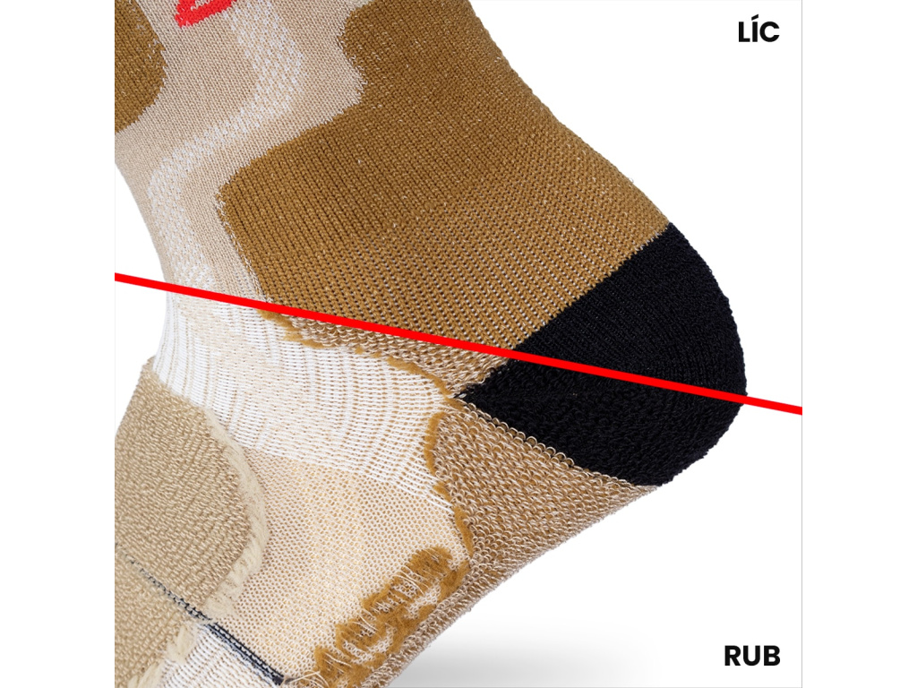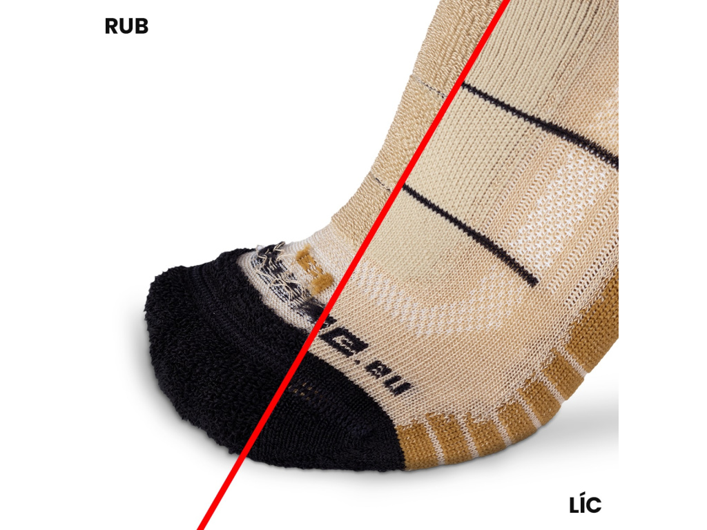 Výrazné plyšování doplněné o zesílení proti oděru je typickým znakem této ponožky. Tvoří její naprostou většinu. V odlehčených částech ponožky se nacházejí odvětrávací kanálky pro lepší odvod vlhkosti a termoregulaci. Kvůli celkové výšce ponožky klademe důraz i na dostatečnou roztažnost lemu.