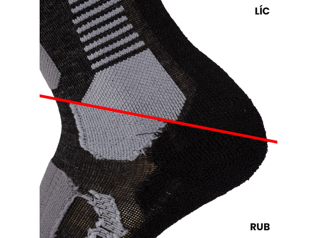 | Vlna je napletená do celé délky ponožek. | Vlna je napletená pouze do paty, špičky a Achilovky. |