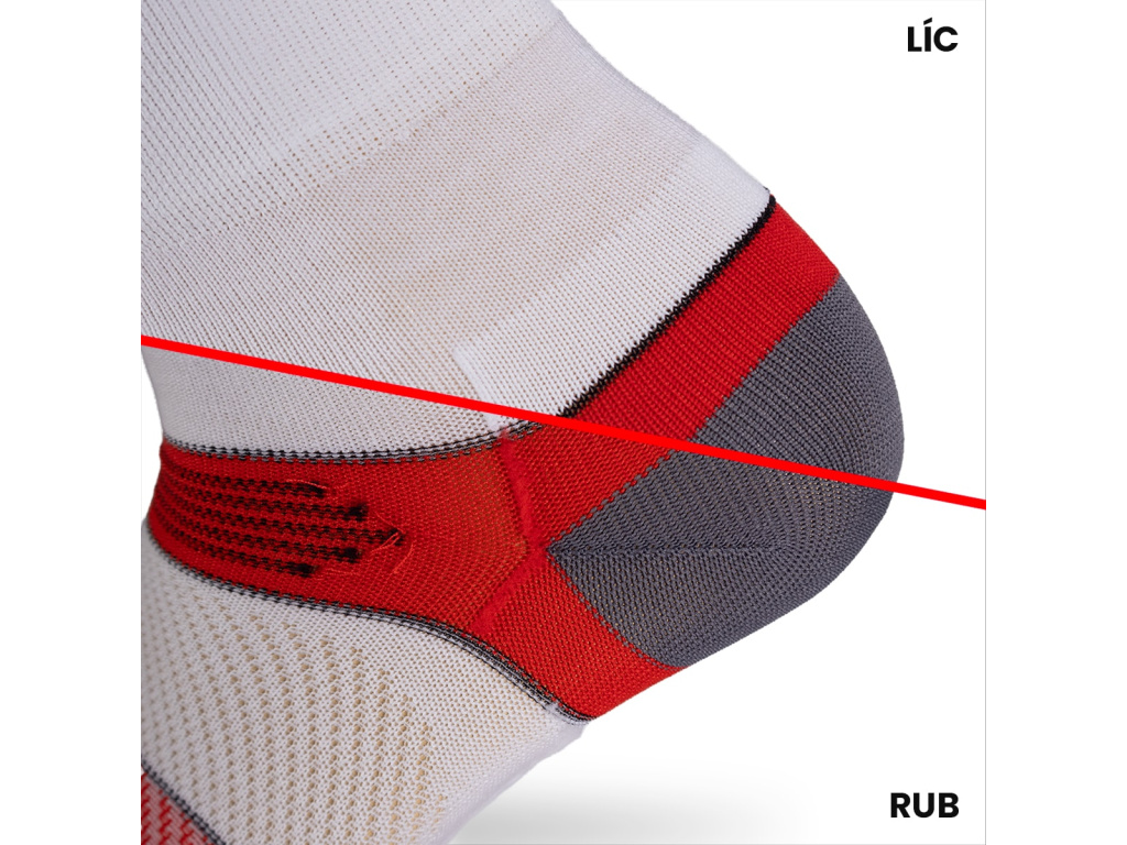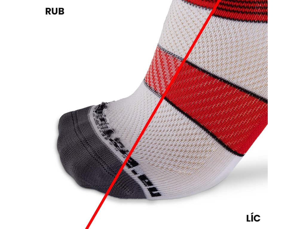Právě odvětrání v nártu v souhře s elastickým páskem v chodidle vytváří perfektně padnoucí ponožku: skvěle obepne chodidlo, zamezí nechtěnému posouvání ponožky na noze a předejde tak vzniku poranění chodidla. Špička ponožky je spojená naším neznatelným plochým švem.