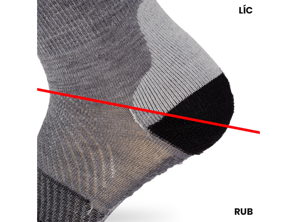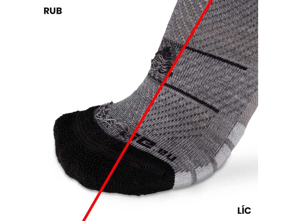 Výrazný podíl prémiové italské merino vlny zajišťuje vynikající termoizolační vlastnosti. Díky přidanému polyamidu do oblasti Achilovky a došlapových částí se můžeš spolehnout na vysokou odolnost ponožky proti prodření a brzkému žmolkování.