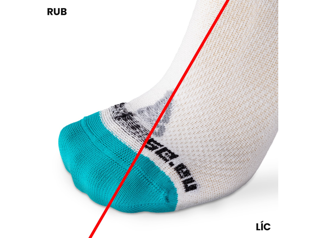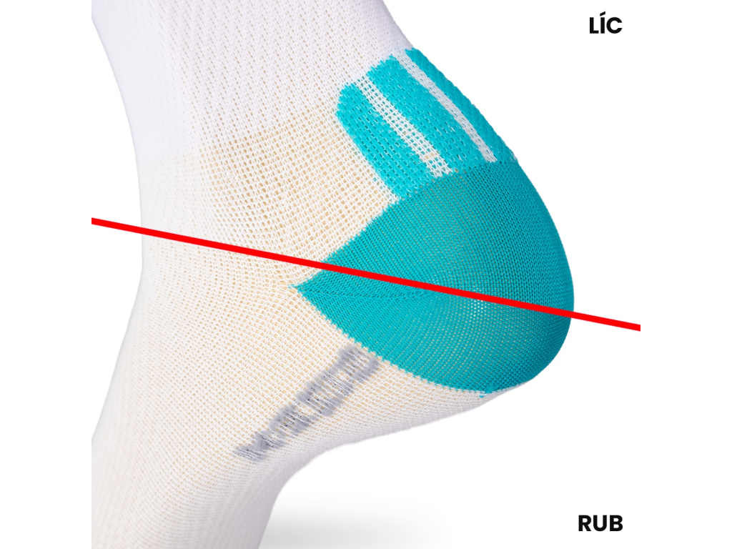 Achilovku jsme doplnili minimalistickým plyšováním. Samozřejmostí je náš neznatelný plochý šev ve špičce a rozlišení ponožek na levou a pravou poskytuje každé noze správnou podporu a respektuje její specifické odlišnosti. Došlapová část ve špičce je zesílená.
